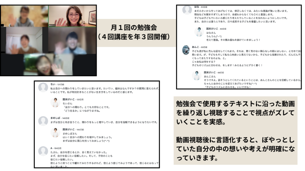 A:今まで受講された方からは、動画を繰り返し視聴して、コメントで言語化することで理解がすすんだというお声をいただいています。さらに、講座を受講することで腑に落ちることがあり実践に移しやすく、他の方の考えも知ることができた、と講座を合わせることでより日々の変化を実感していただけています。