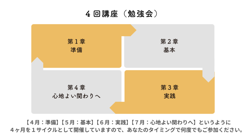勉強会の開催は、4回を1クールとして繰り返し開催しています。クールによって曜日と時間は変わります。再受講は無料ですので、ご参加できなかった回は、次のクールで受講が可能です。講座のアーカイブはありません。その場での参加者とのやりとりや気づきを大事にしています。